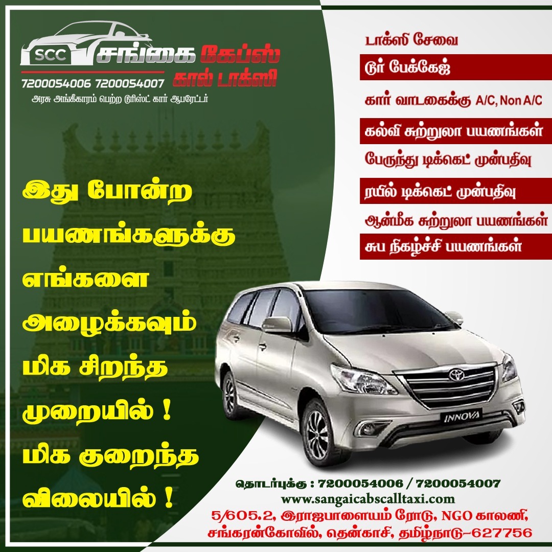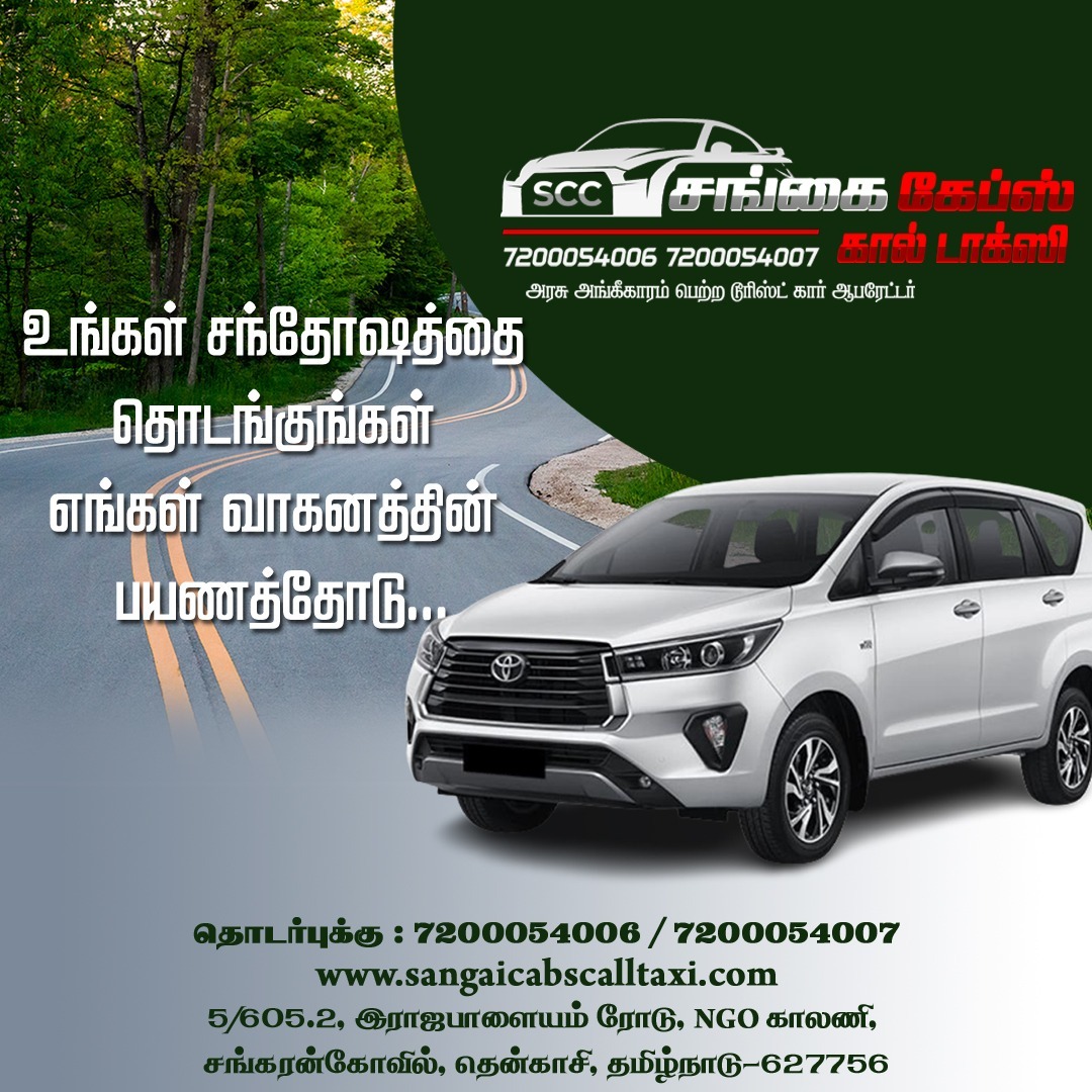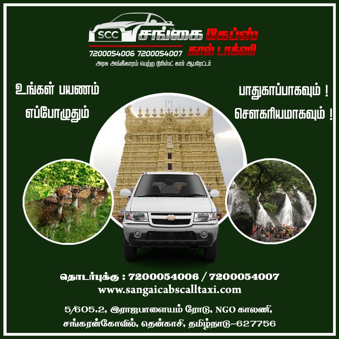 Sangai Cabs and Call Taxi in Sankarankovil has got a lot to offer you. We have car rental services, taxi services and tour packages for every kind of traveller. Our cars are well-maintained and clean. We offer tours for foreign tourists and domestic travelers as well. We also provide tourist vehicles for sightseeing in Sankarankovil and other places in Tamil Nadu.